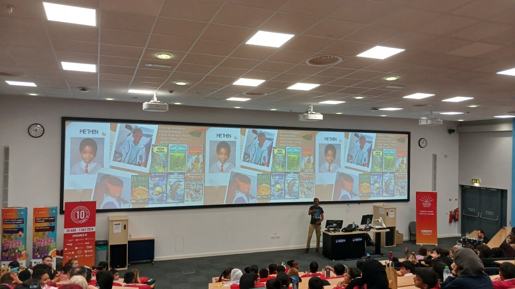 Ashley draws upon his own relationship with reading and writing to build engaging narratives which have the children wanting more. His workshop allowed the children to see themselves as writers and to believe that they too have a story to tell.